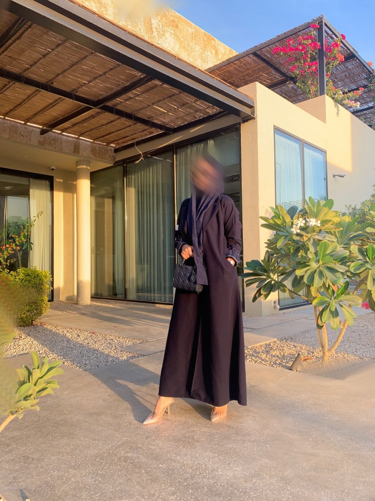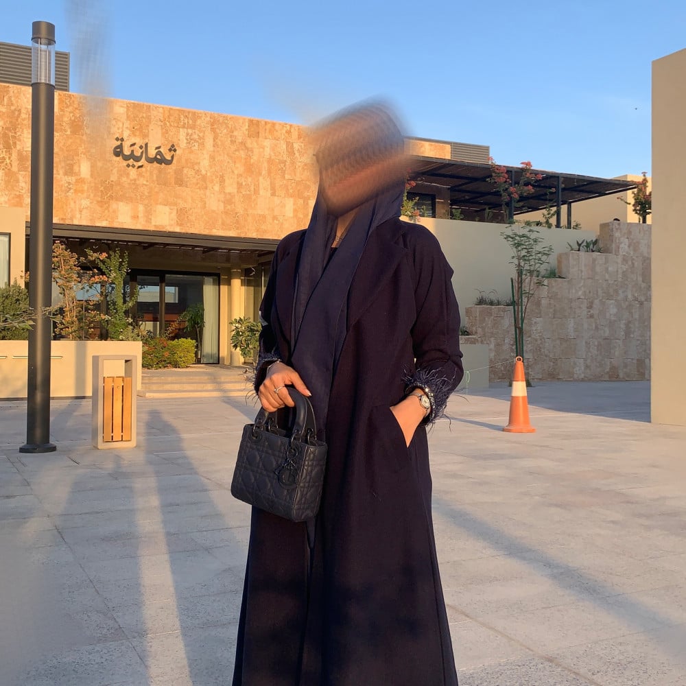 عباية شتوية جوخ ناعم بجيوب وأكمام شك وريش كحلي