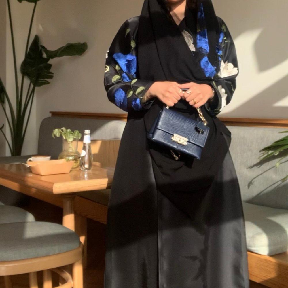 Abaya made of crepe material, half wrap, with embroidered sleeves and flowers. The color of the abaya is black