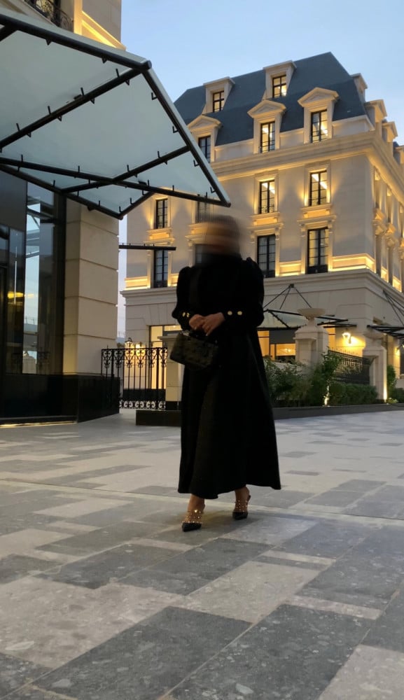 Winter abaya, raw tweed Chanel, black color, model with formal puff sleeves, wrapped in half cloches